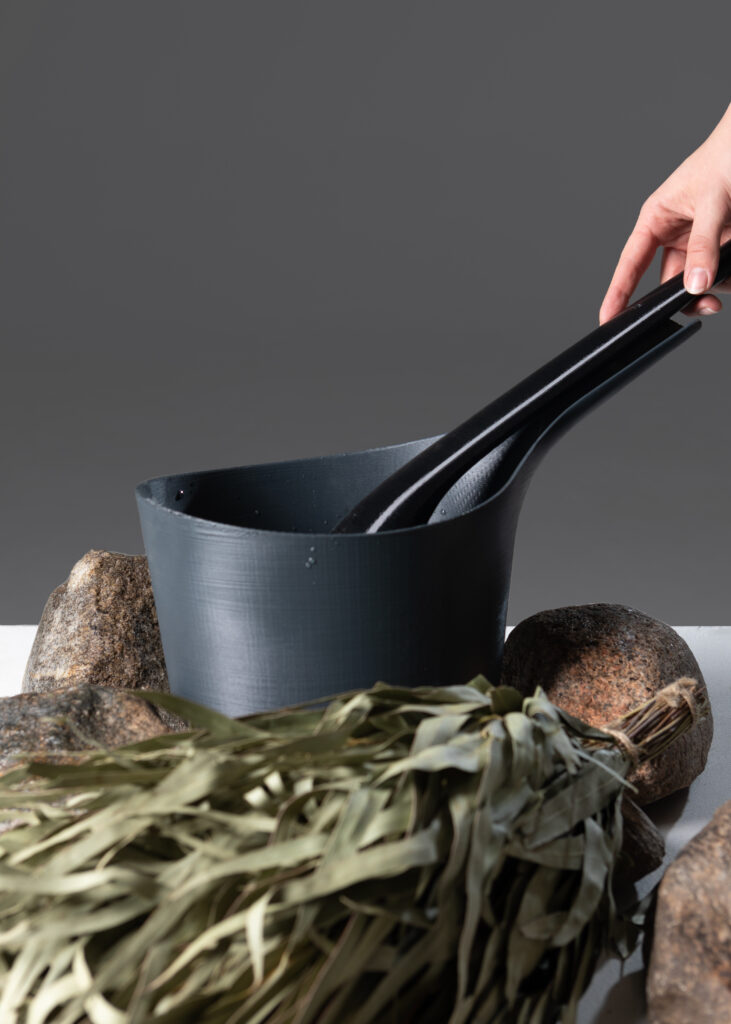 The aim of the final project is to design and develop a set of sauna bucket and ladle. The product draws attention to the ritual of steam bathing, ensuring efficient use of water, especially in saunas with an electric heater.