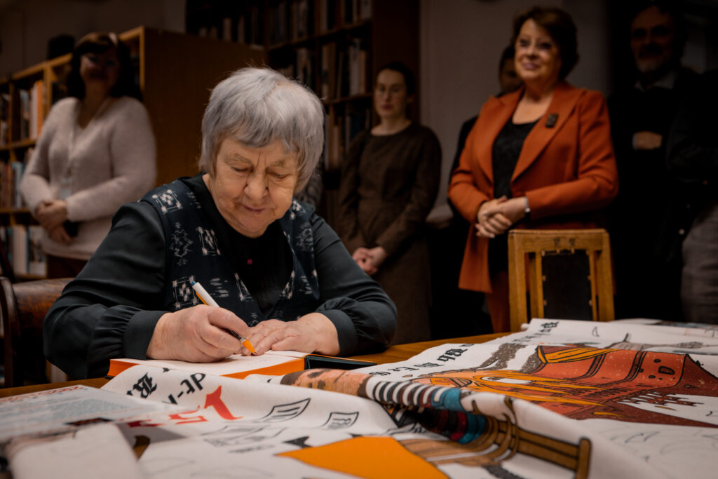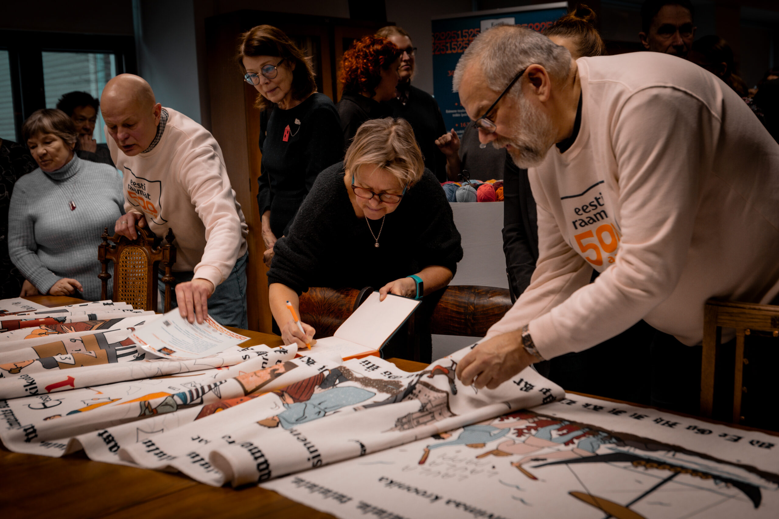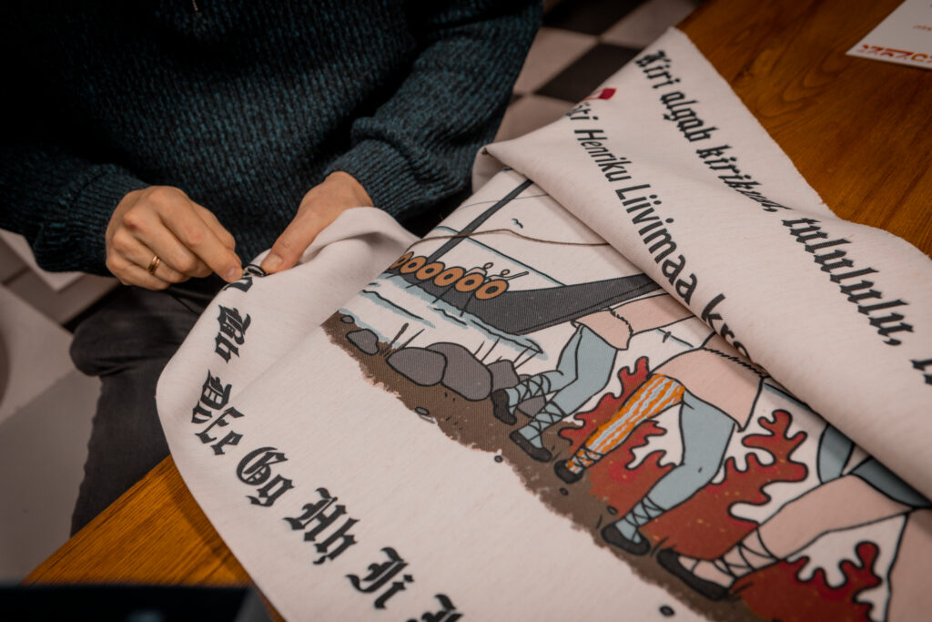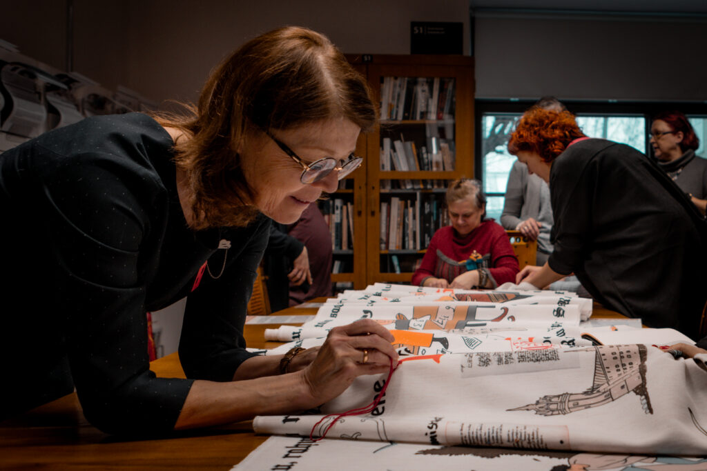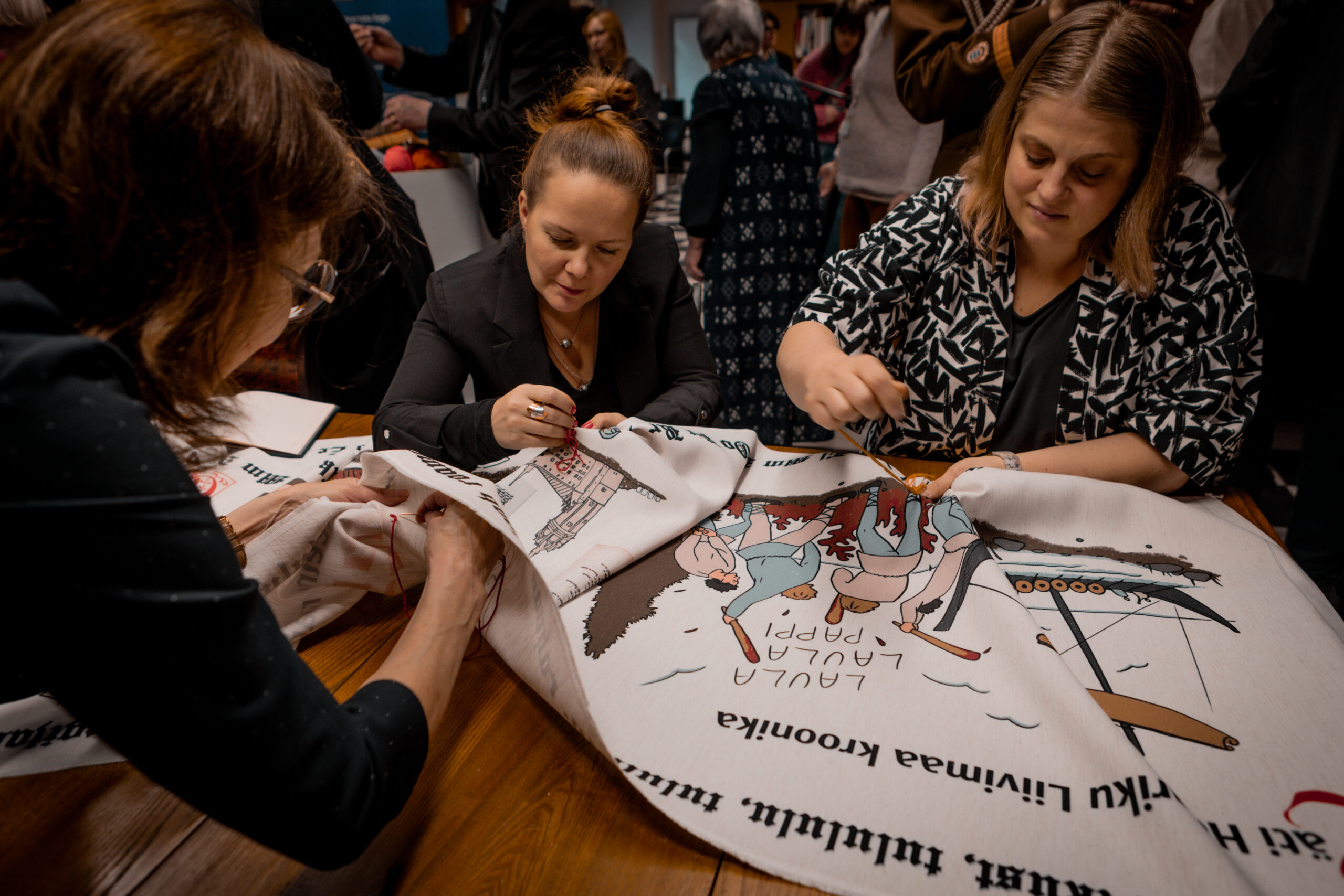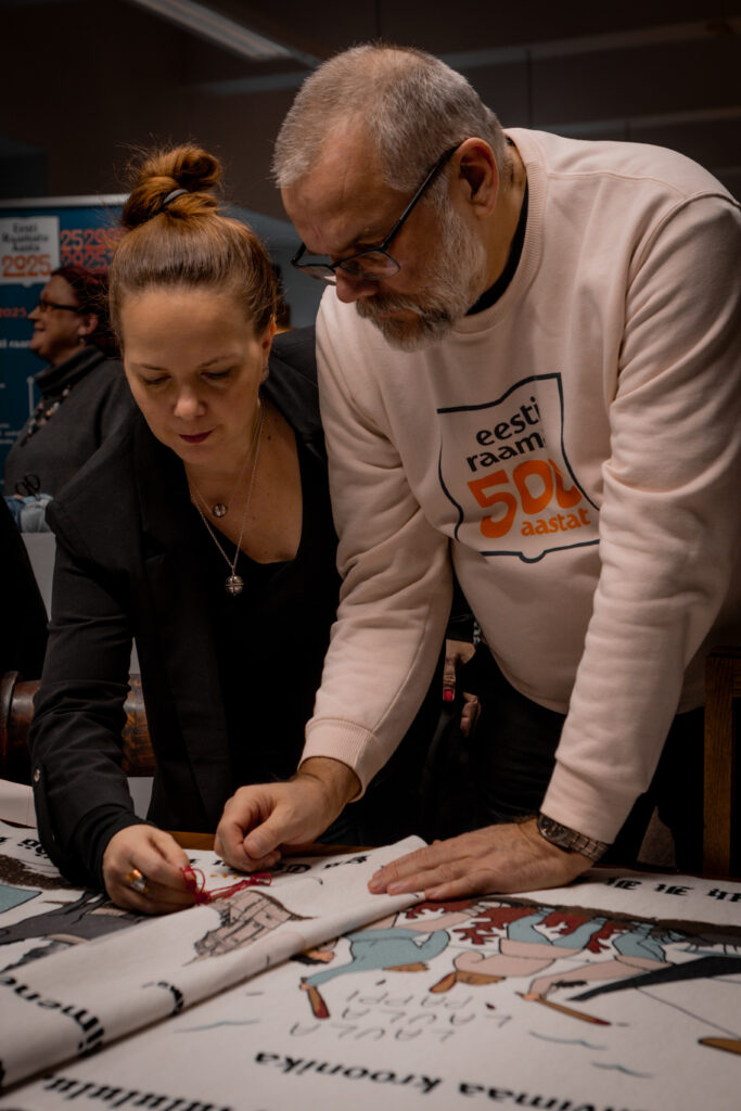 The tapestry “500 Years of the Estonian Book” depicts key events in the history of the Estonian book through visual imagery, as well as dates and textual references. The 16.5-meter-long tapestry, featuring a design digitally printed onto fabric, will be inaugurated with its first stitches at a ceremonial opening event at Pallas. Participants will include Sirje Karis, Anu Raud, Krista Aru, Mart Jagomägi, representatives of the Estonian Folk Art and Craft Union, members of the Year of the Estonian Book steering committee, and representatives of Pallas. The tapestry will also be on display in the Pallas library on February 12. Over the course of the year, it will travel to all counties of Estonia, where it will continue to be embroidered as a community project in local libraries.