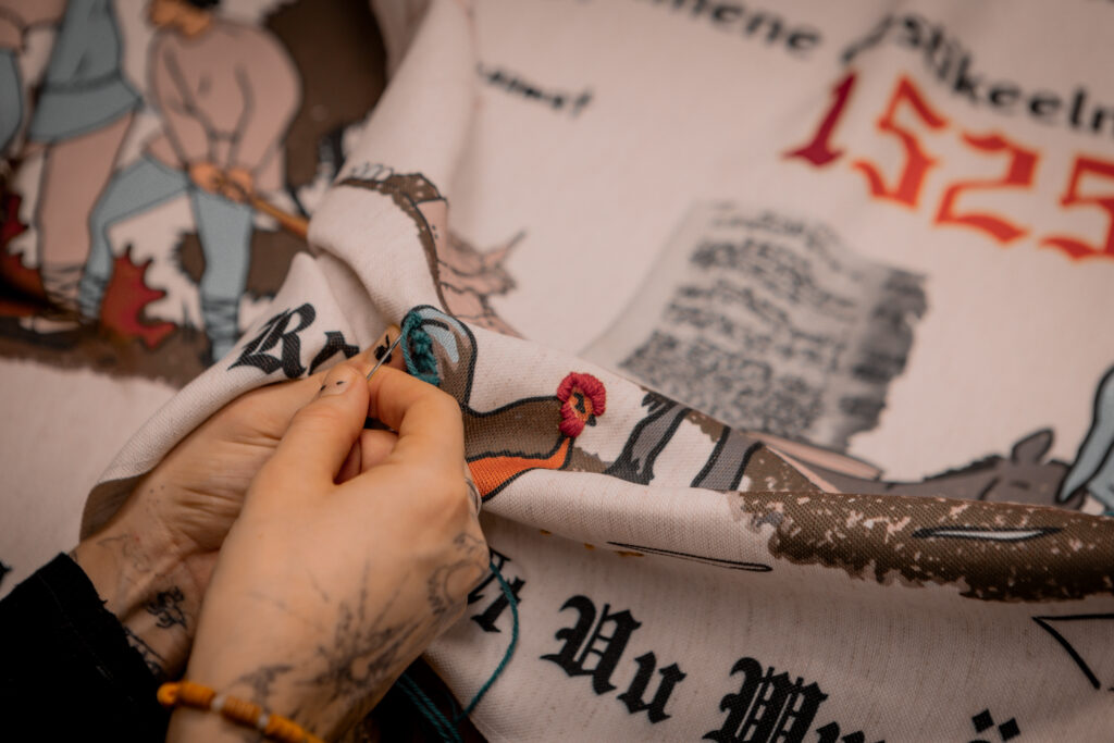 The idea of marking 500 years of the Estonian book with a collaboratively created tapestry, to which people across Estonia could contribute, was proposed by Mart Jagomägi, Vice-Chair of the Year of the Estonian Book steering committee. The selection of events depicted on the tapestry was made by Krista Aru and Mart Jagomägi and translated into visual form by students of the Pallas Textile Department. The embroidery process is curated and guided by the Estonian Folk Art and Craft Union.